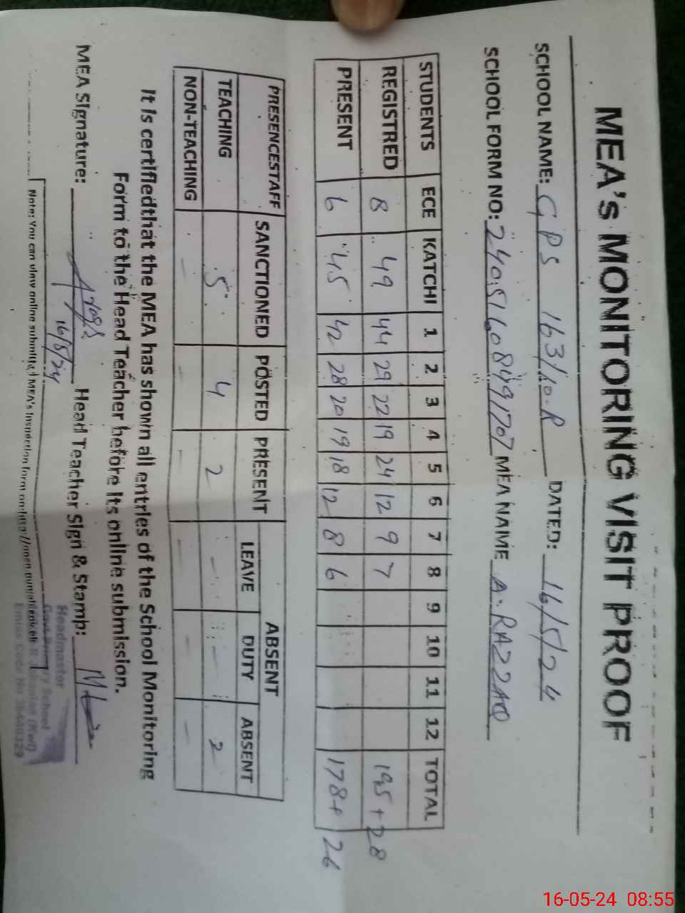 | Total no. of Classrooms: 3 No. of Classrooms Used for Teaching: 3 No. of Classrooms Storing Old Furniture, FTBs, etc: 0Comments if Any: HT teacher is absent and one teacher also absent nsb and FTF record not available |