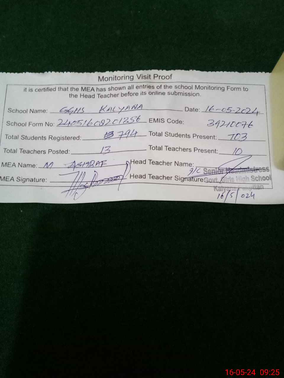 | Certified that this School was Inspected by the Undersigned MEA/DMO Today and the Information Stated Above is as Per Record. | |||||