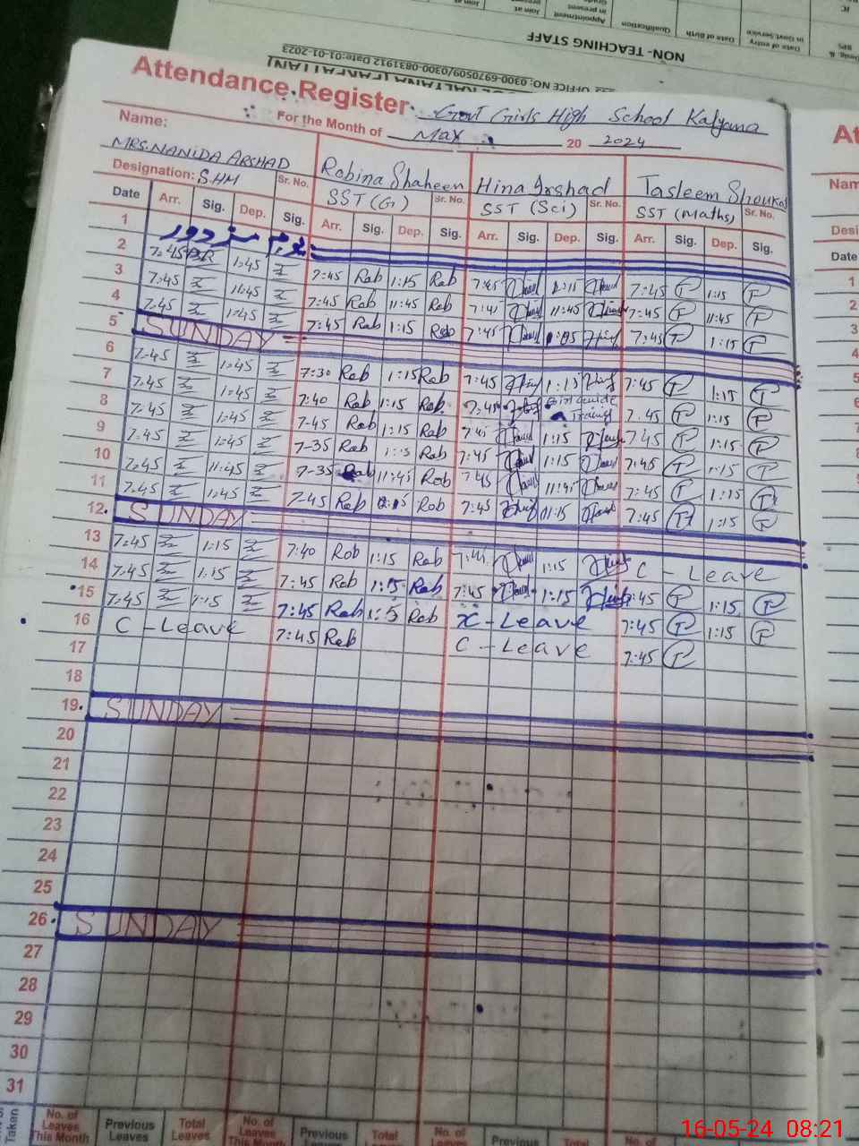 | CNIC | Full Name | Designation | R/C | Absence During Last Calender Month |