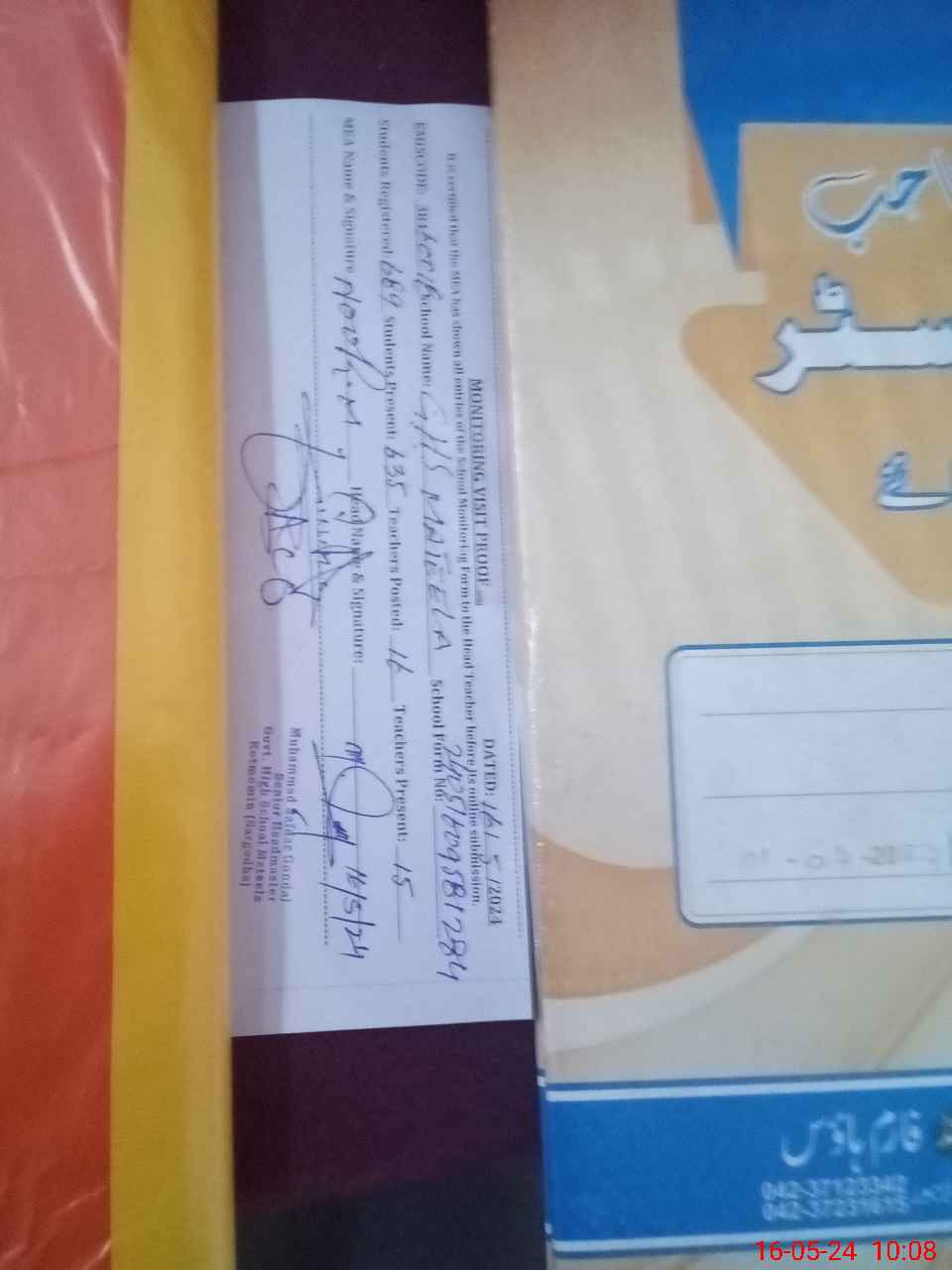 | Name: AB**** RA**** Designation: (School Headmaster's/Headmistress's) In charge HM Phone/Cell Number: 03**** |