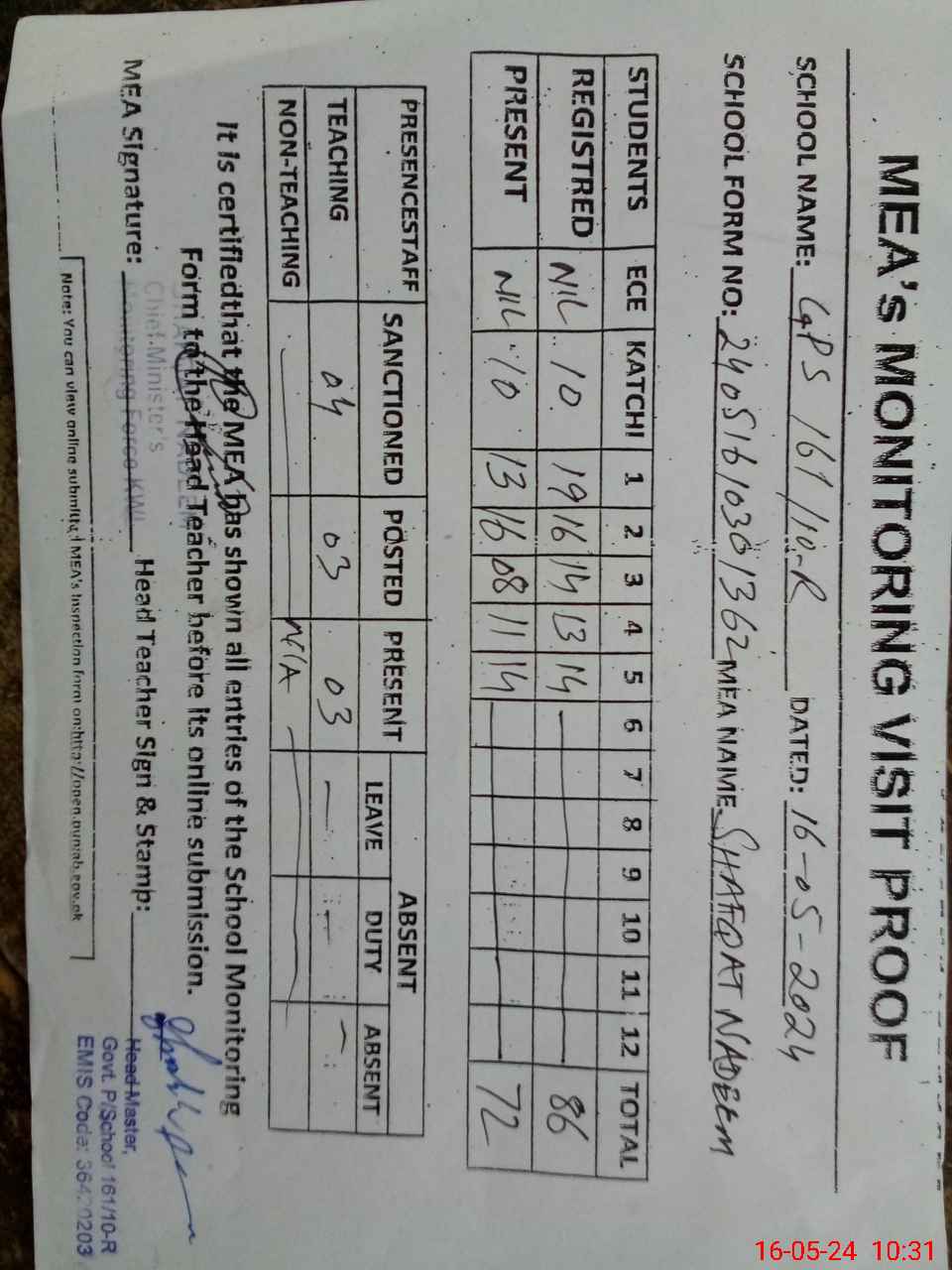 | Attendance Register | Head Teacher | MEA with School | Visit Proof |