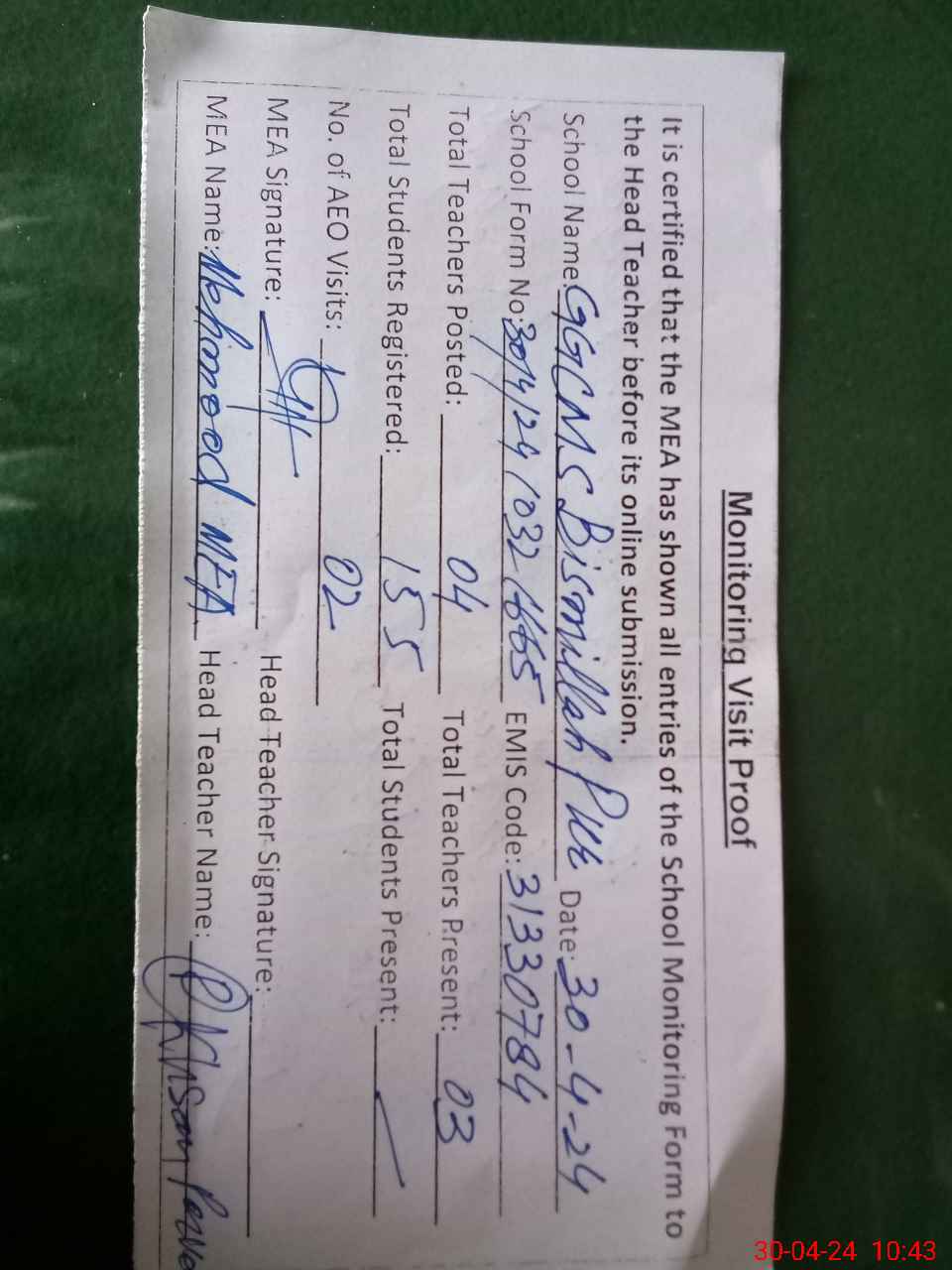 | EMIS Code: 31330784 | Name of School: GGCMS BISMILLAH PUR | |||