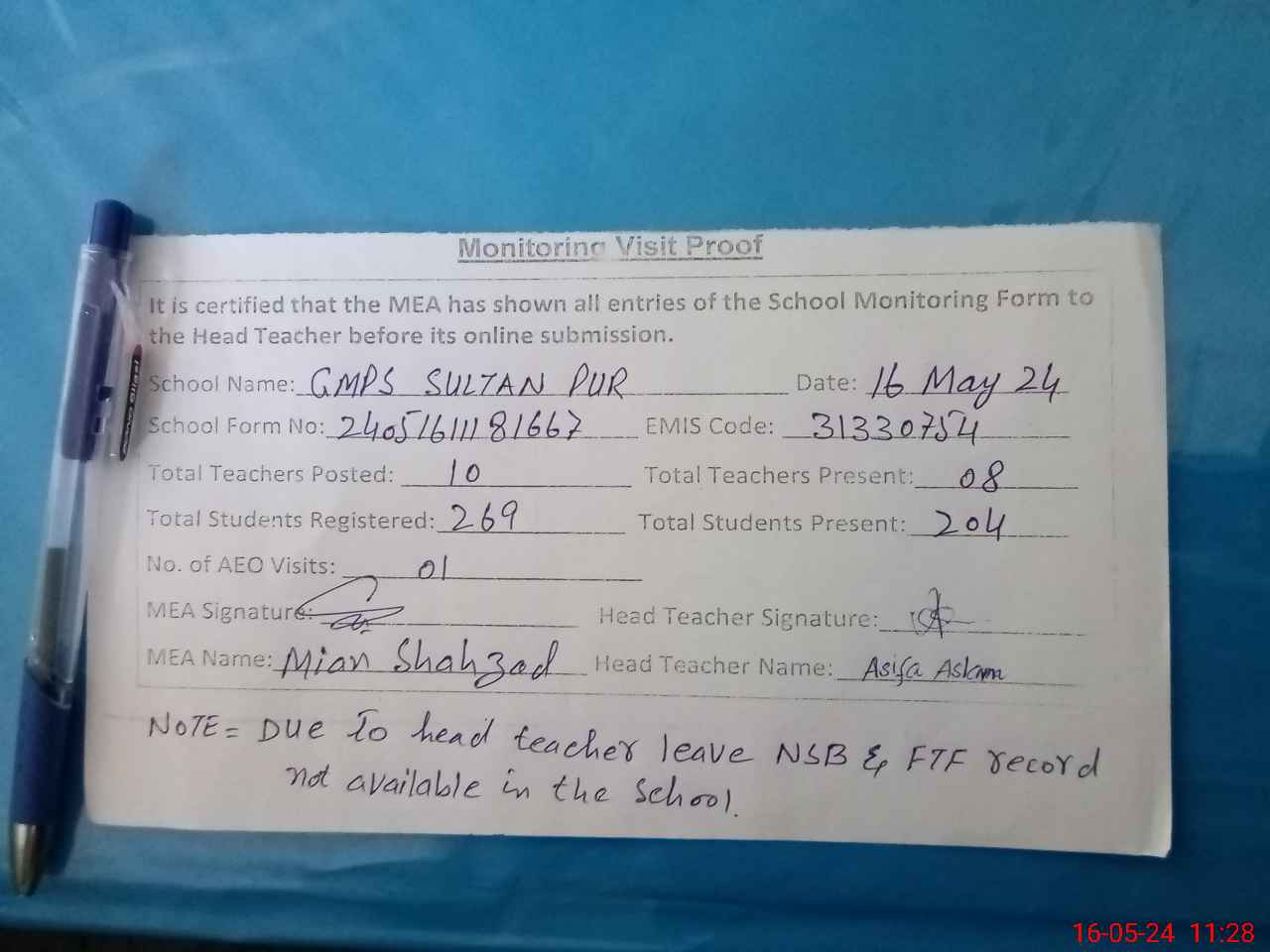 | EMIS Code: 31330754 | Name of School: GMPS SULTAN PUR | |||
