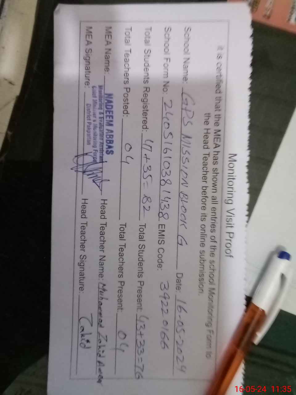 | Attendance Register | Head Teacher | MEA with School | Visit Proof |