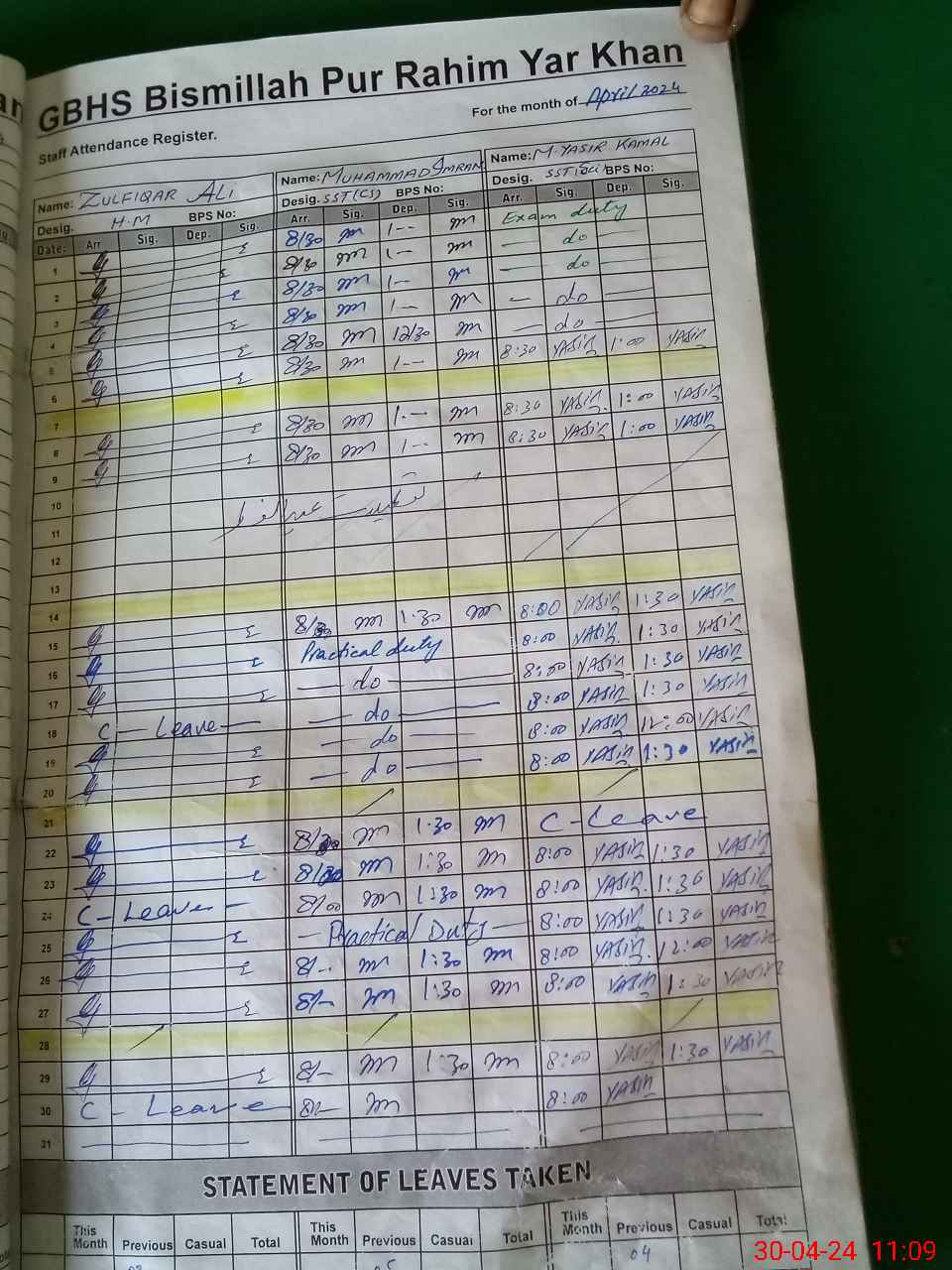 | CNIC | Full Name | Designation | R/C | Absence During Last Calender Month |