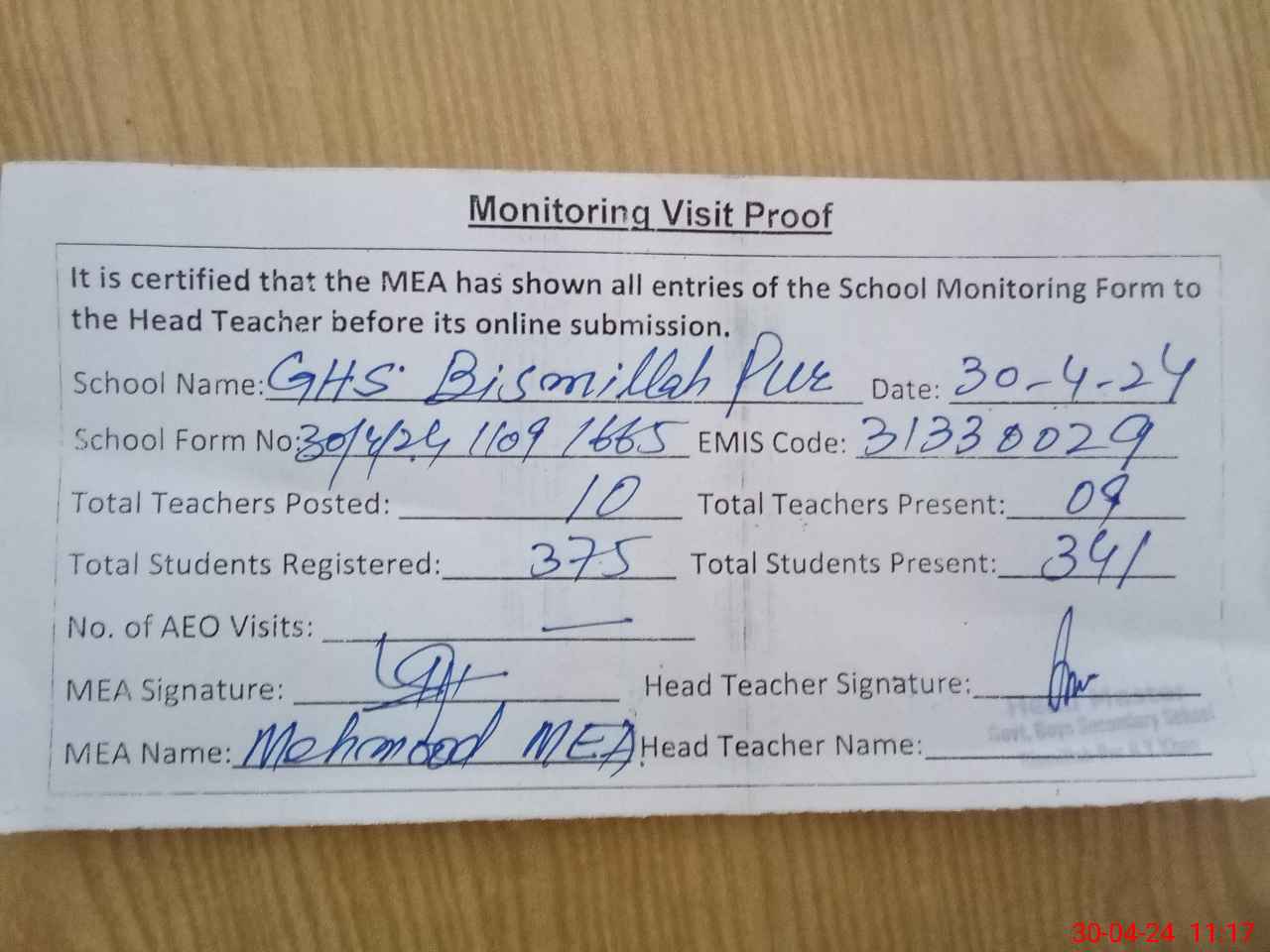 | Attendance Register | Head Teacher | MEA with School | Visit Proof |