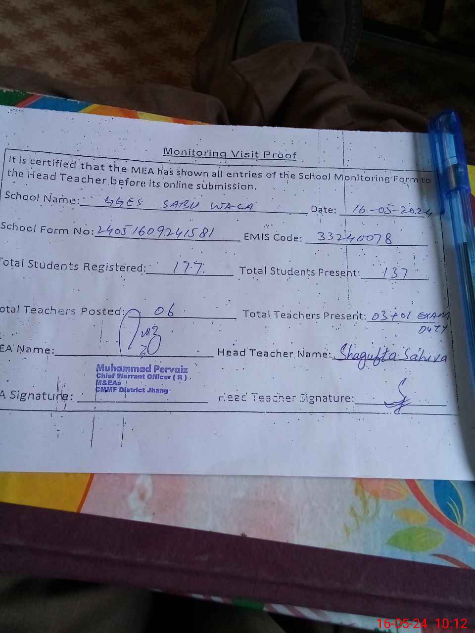 | Attendance Register | Head Teacher | MEA with School | Visit Proof |