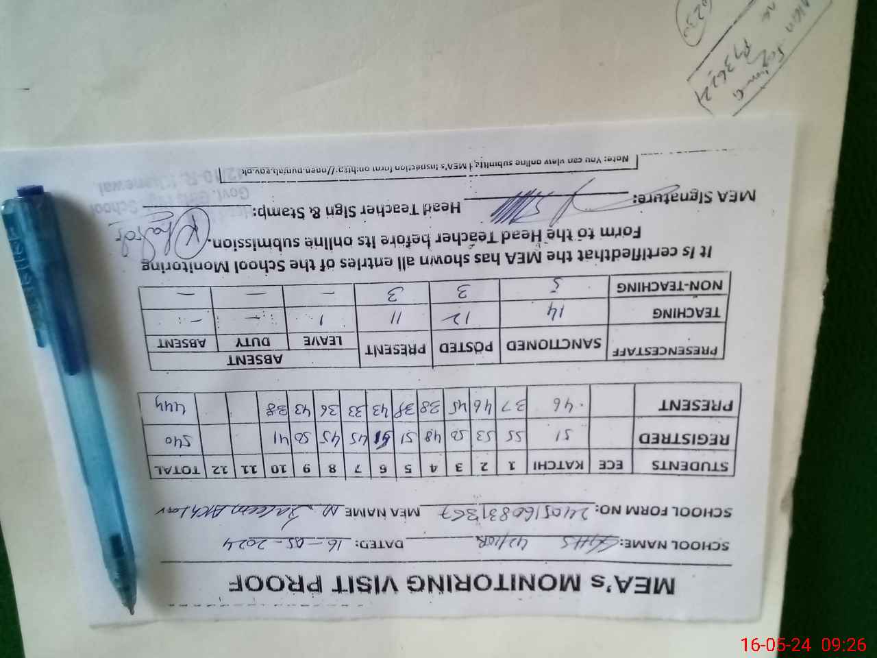 | Attendance Register | Head Teacher | MEA with School | Visit Proof |