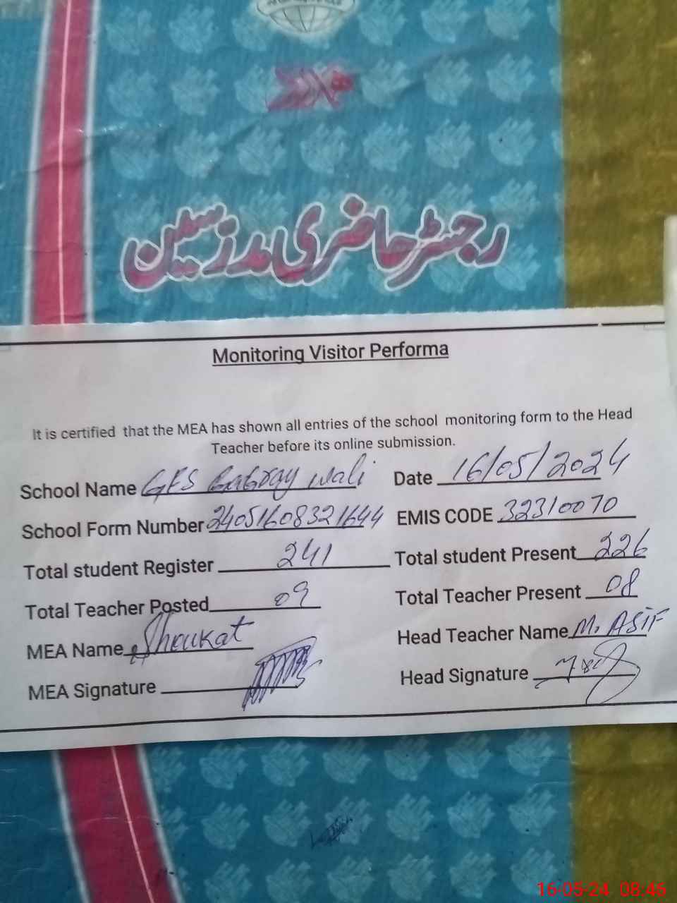 | Certified that this School was Inspected by the Undersigned MEA/DMO Today and the Information Stated Above is as Per Record. | |||||