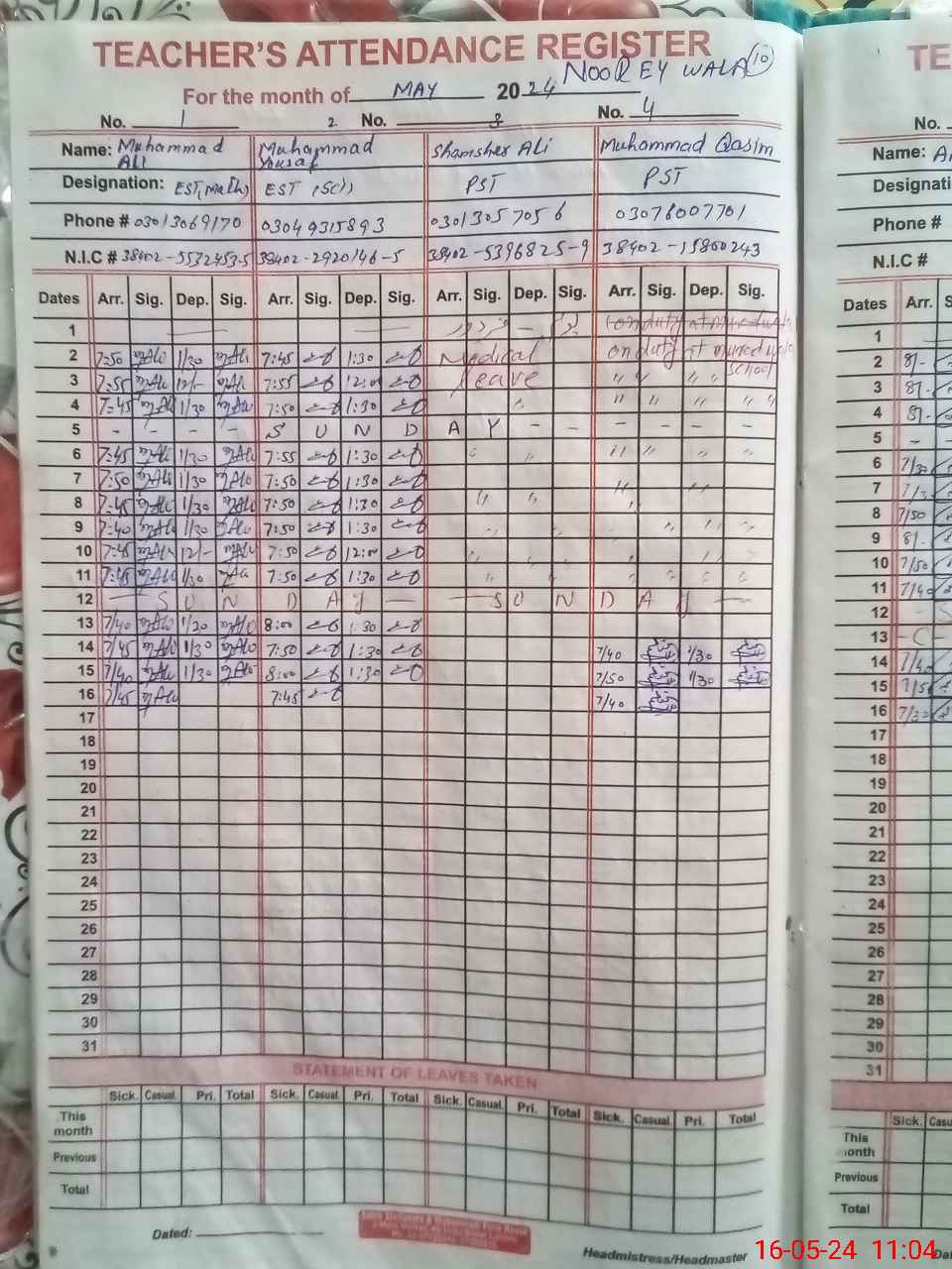 | CNIC | Full Name | Designation | R/C | Absence During Last Calender Month |