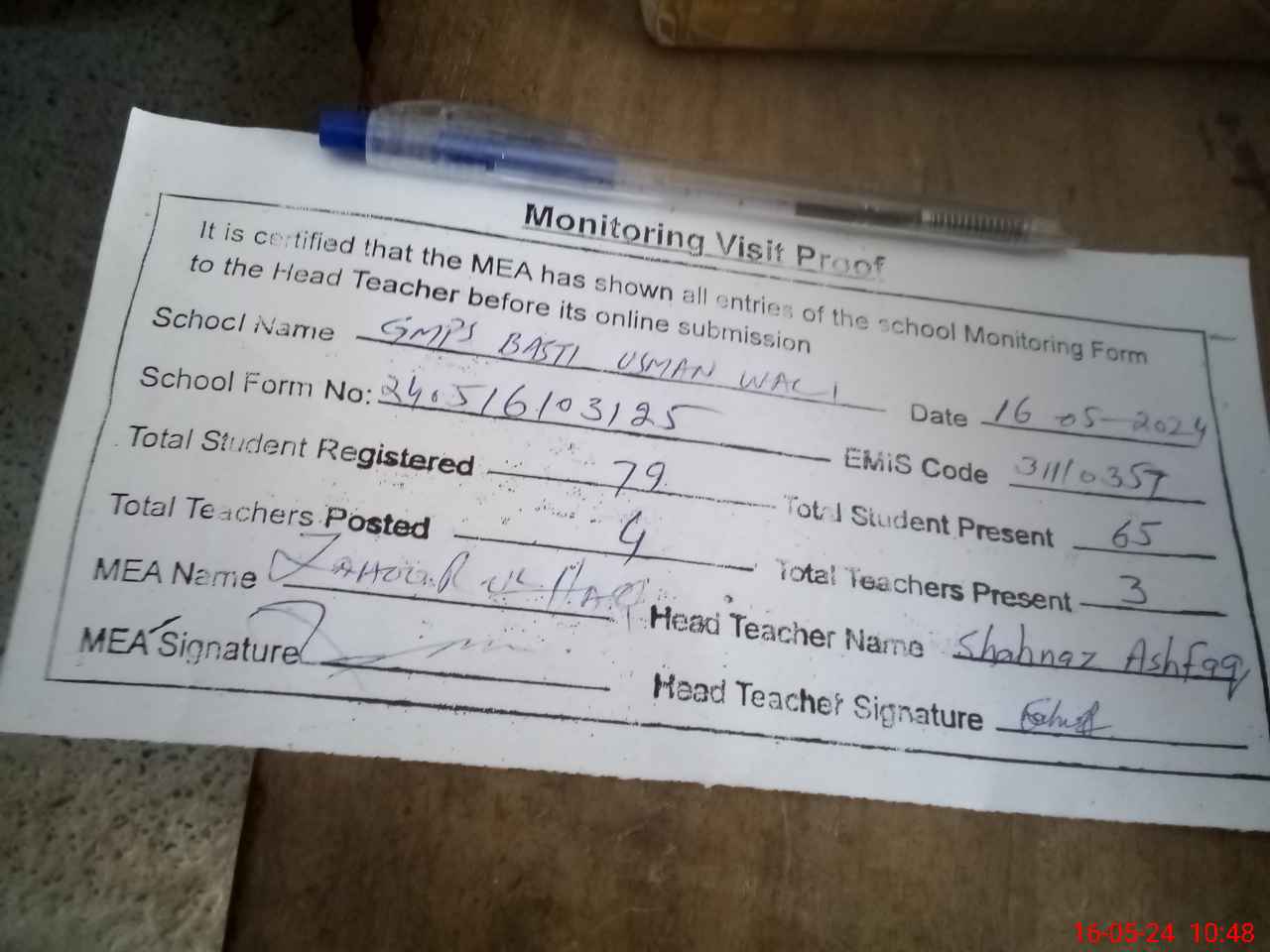 | EMIS Code: 31110357 | Name of School: GMPS BASTI USMAN WALI | |||