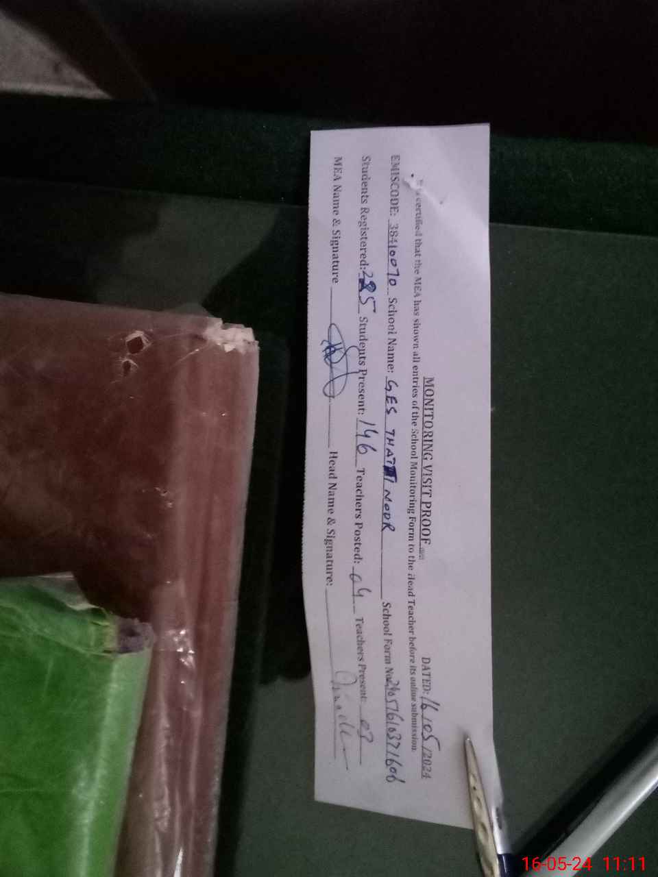 | Attendance Register | Head Teacher | MEA with School | Visit Proof |