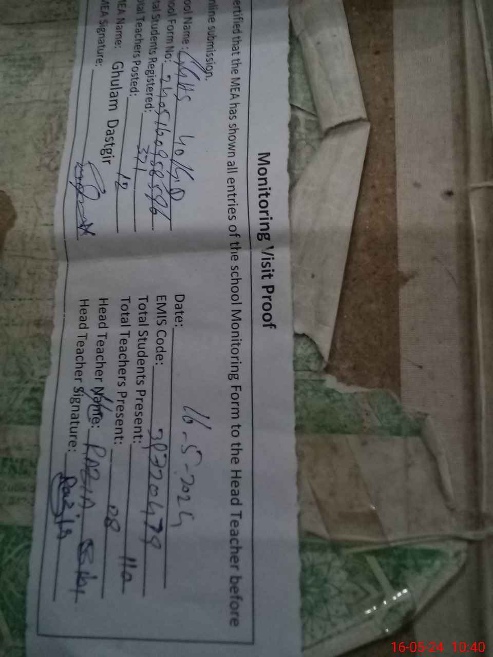 | Attendance Register | Head Teacher | MEA with School | Visit Proof |
