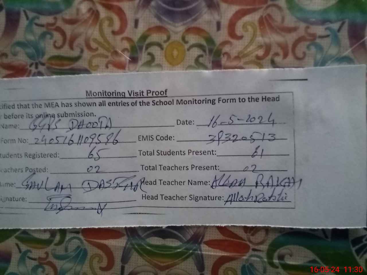 | Attendance Register | Head Teacher | MEA with School | Visit Proof |