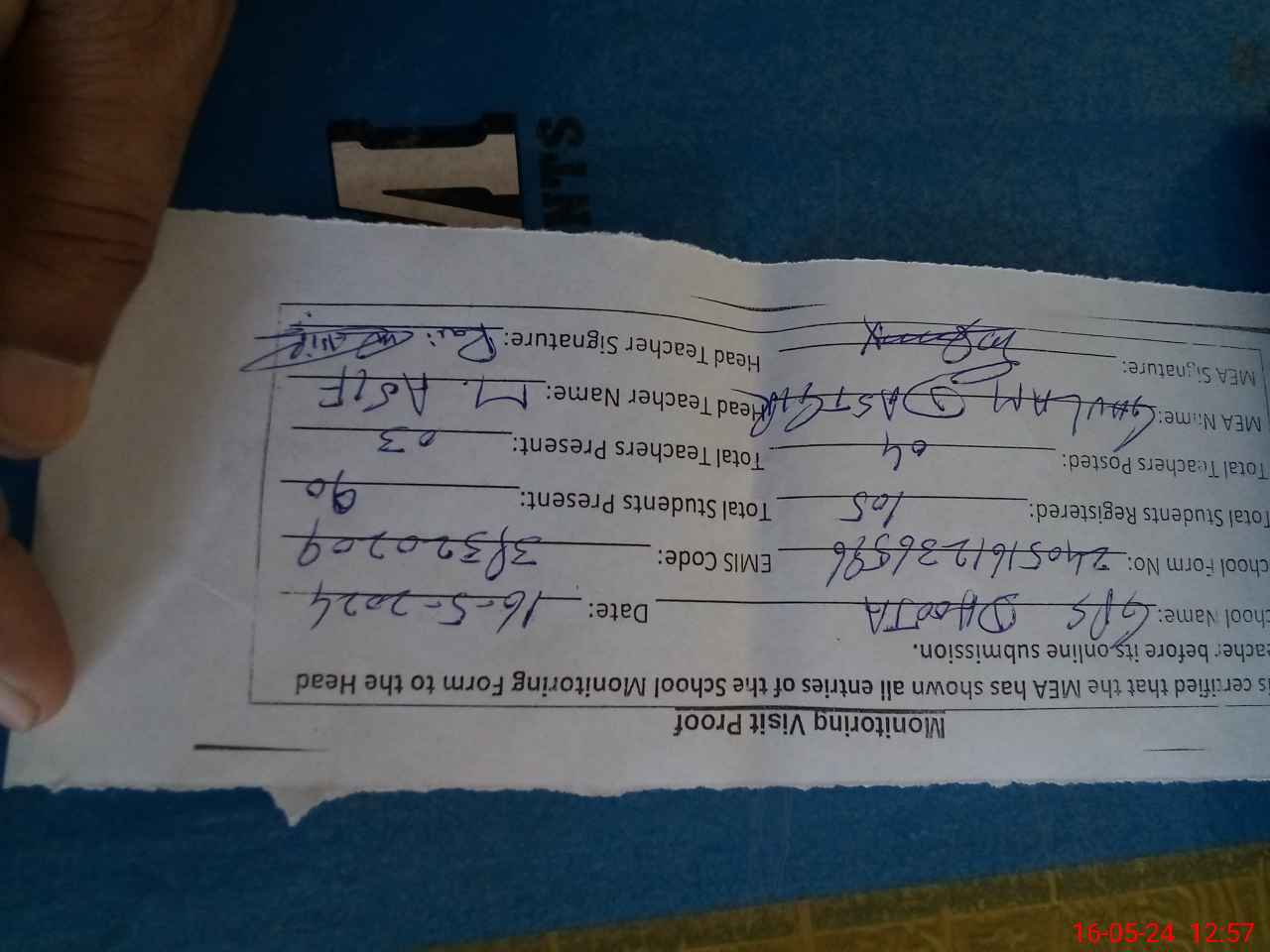 | Name: Mu**** As**** Designation: (School Headmaster's/Headmistress's) HEADMASTER Phone/Cell Number: 03**** |