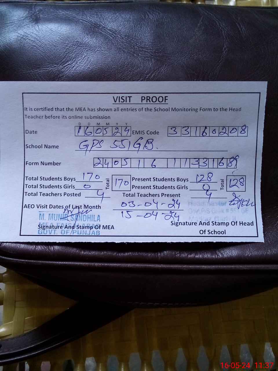 | Attendance Register | Head Teacher | MEA with School | Visit Proof |