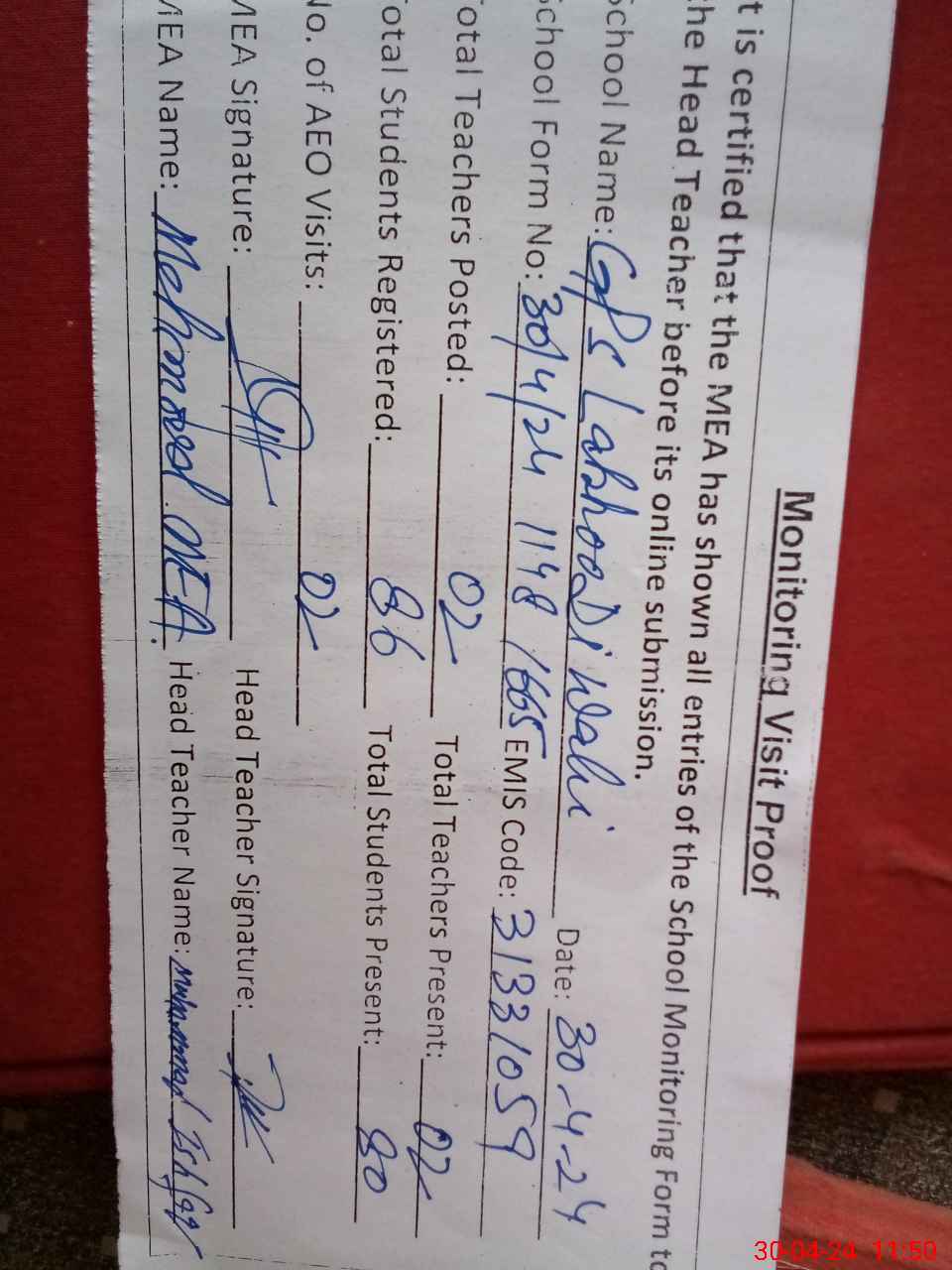 | Attendance Register | Head Teacher | MEA with School | Visit Proof |