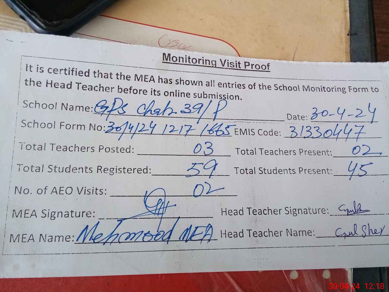 | EMIS Code: 31330447 | Name of School: GPS CHAK NO. 39/P | |||