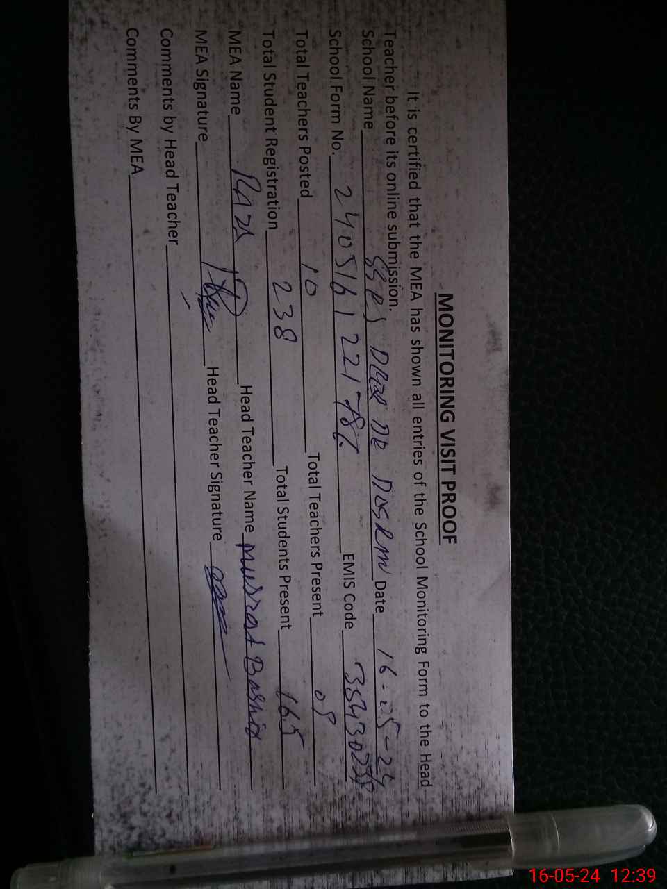 | Attendance Register | Head Teacher | MEA with School | Visit Proof |