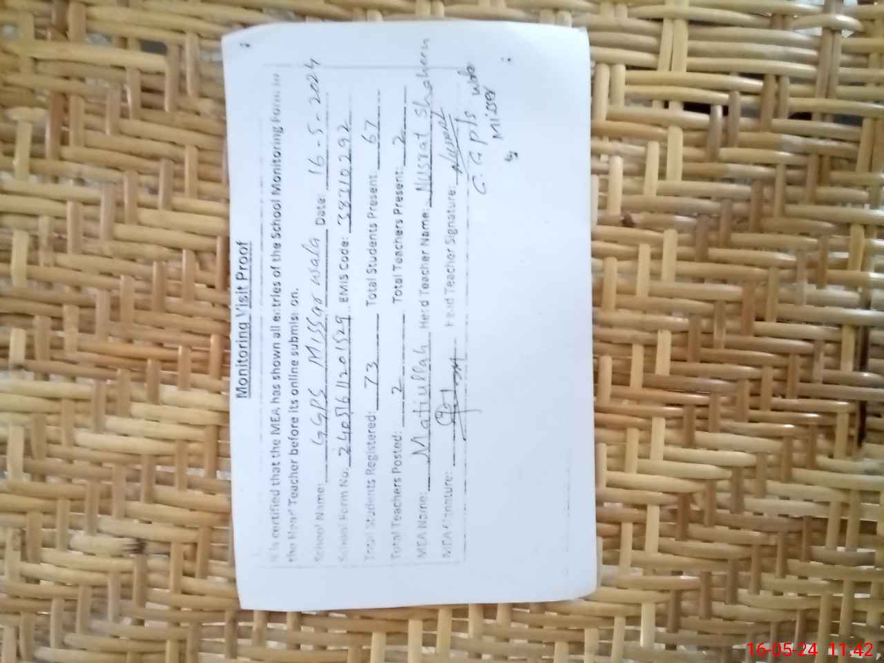 | Attendance Register | Head Teacher | MEA with School | Visit Proof |