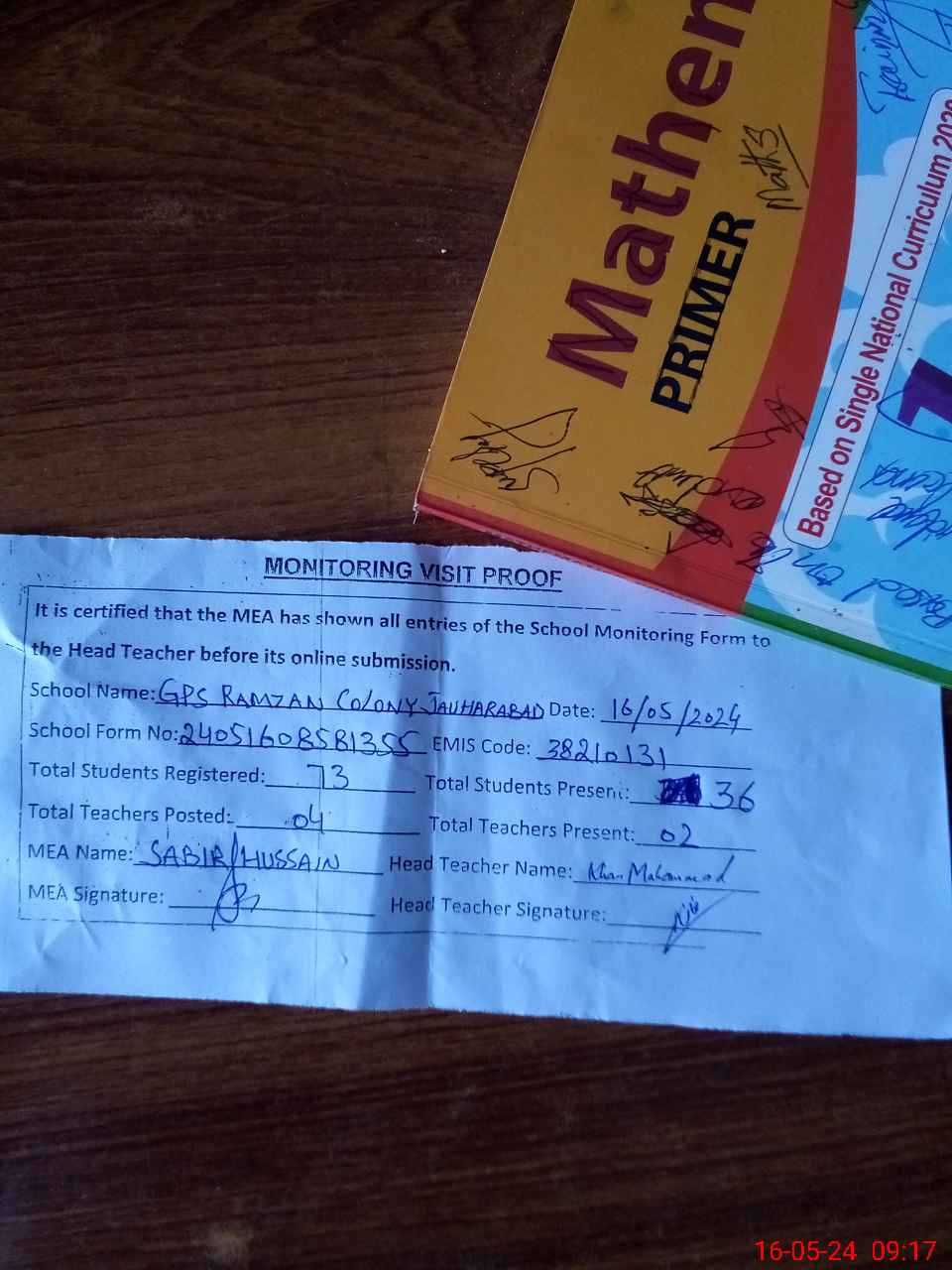 | EMIS Code: 38210131 | Name of School: GPS RAMZAN COLONY JOUHARABAD | |||