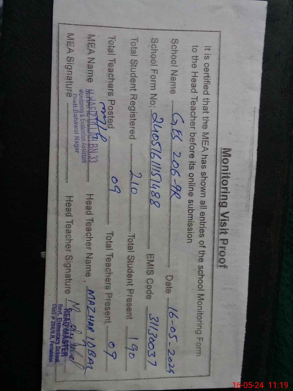| EMIS Code: 31130037 | Name of School: GES CHAK NO. 206/9-R | |||