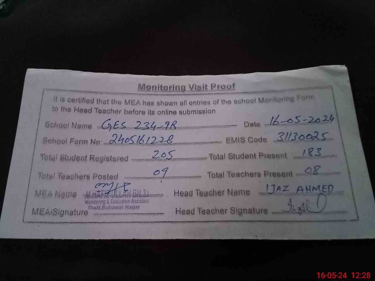 | Attendance Register | Head Teacher | MEA with School | Visit Proof |