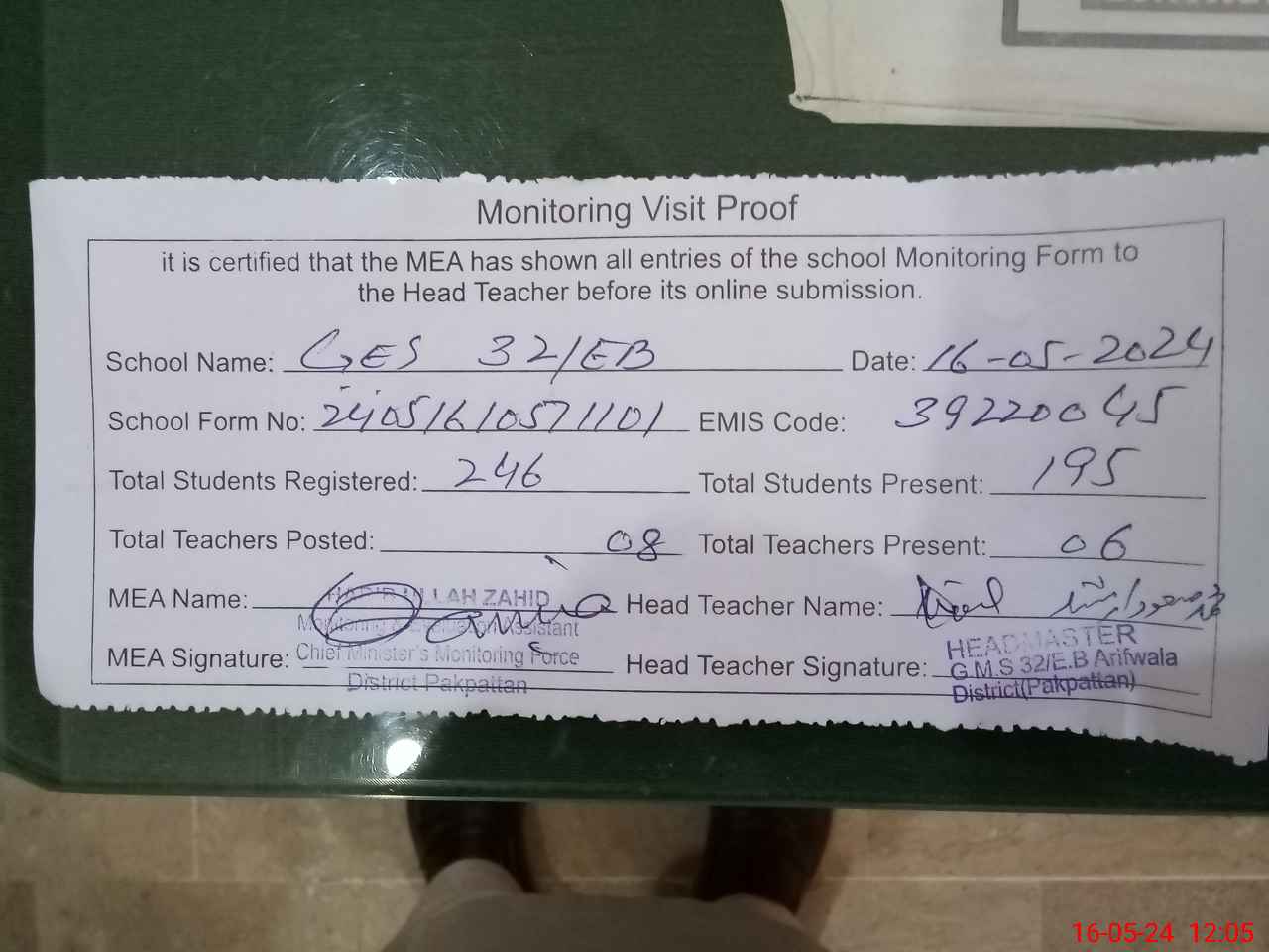 | Attendance Register | Head Teacher | MEA with School | Visit Proof |