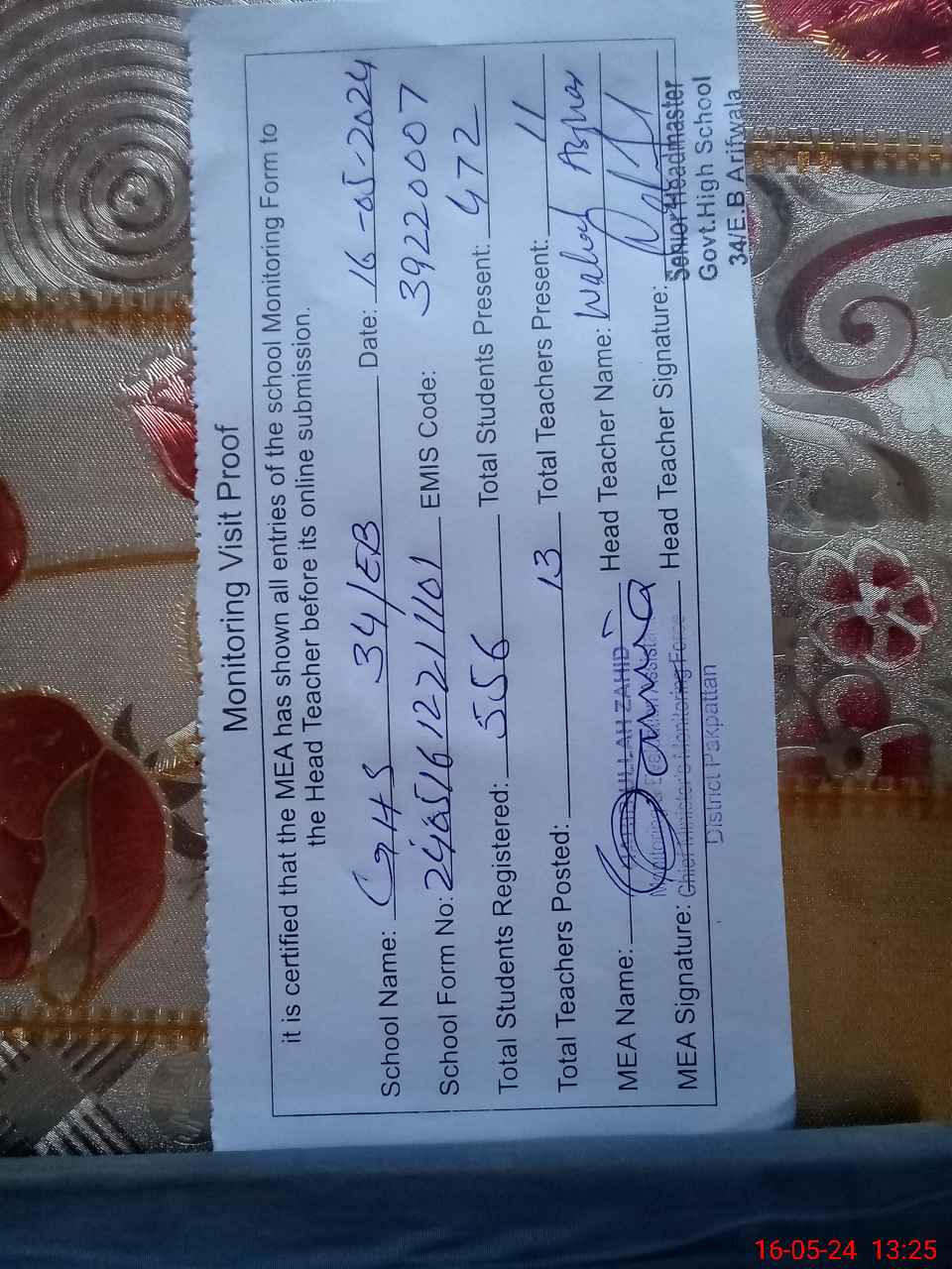 | EMIS Code: 39220007 | Name of School: GHS 34 EB ARIF WALA | |||