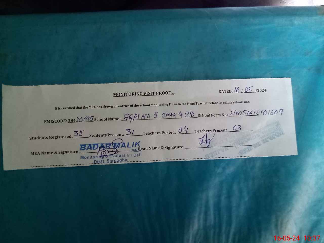 | Attendance Register | Head Teacher | MEA with School | Visit Proof |