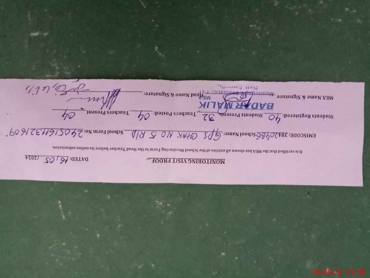 | Certified that this School was Inspected by the Undersigned MEA/DMO Today and the Information Stated Above is as Per Record. | |||||