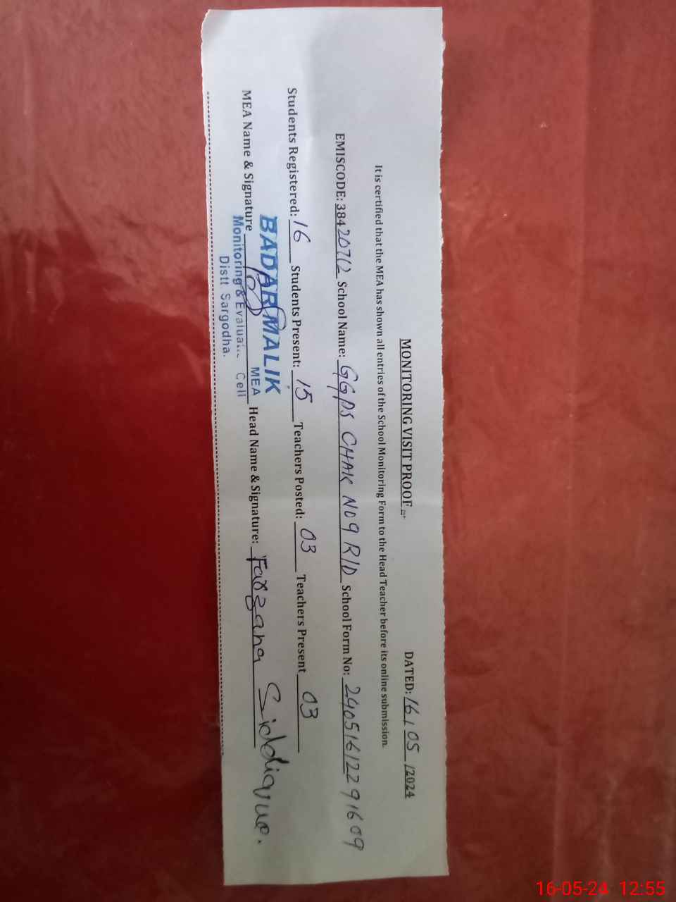 | Certified that this School was Inspected by the Undersigned MEA/DMO Today and the Information Stated Above is as Per Record. | |||||