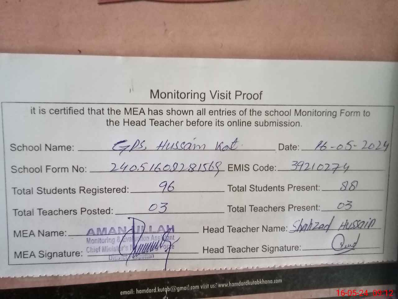 | Attendance Register | Head Teacher | MEA with School | Visit Proof |