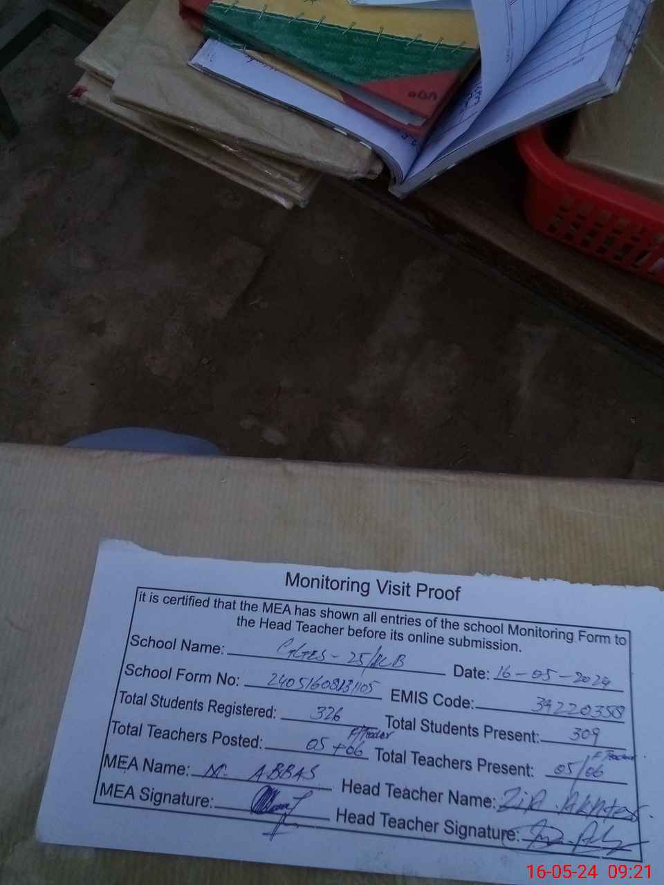 | Attendance Register | Head Teacher | MEA with School | Visit Proof |