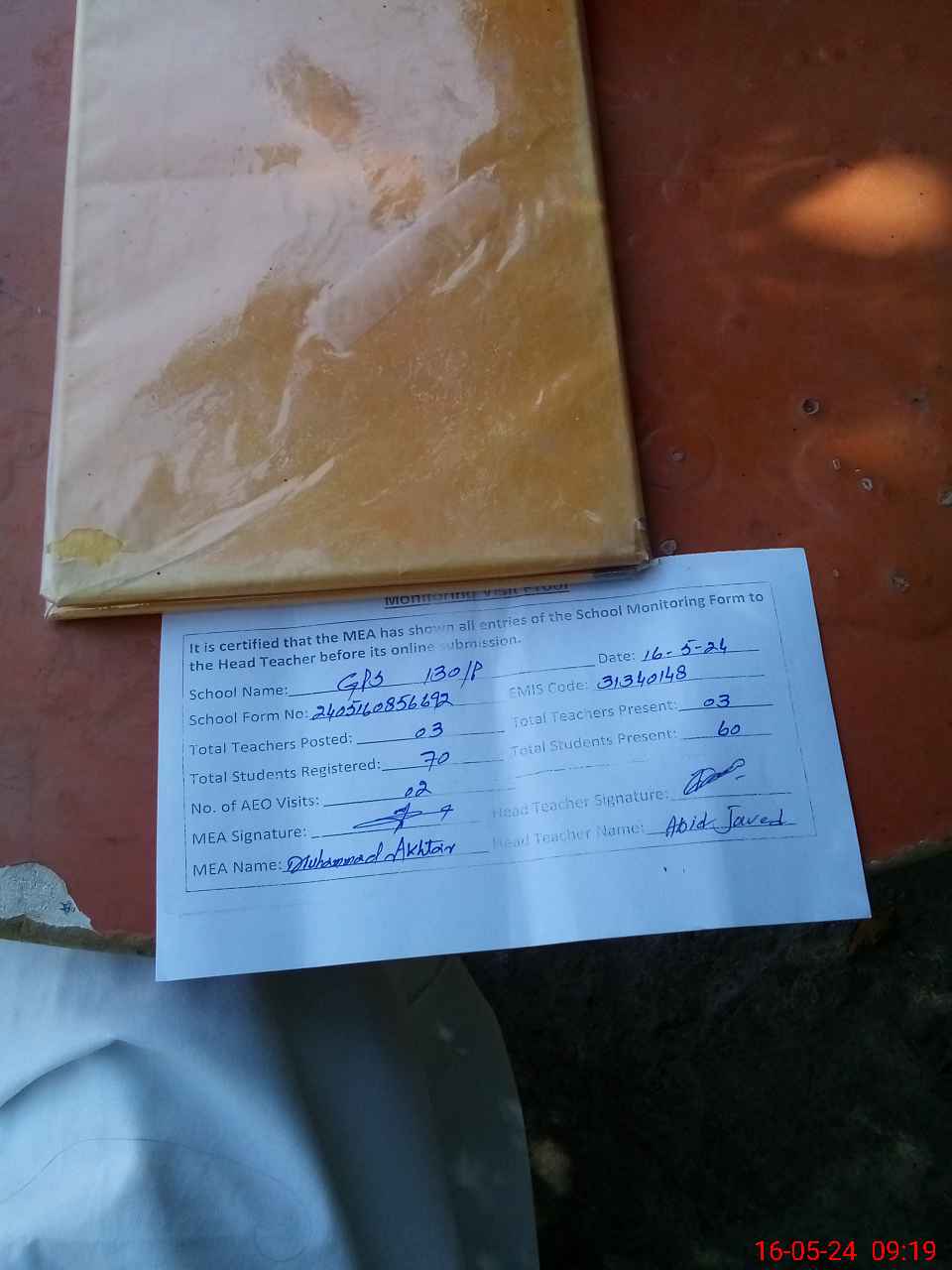 | Attendance Register | Head Teacher | MEA with School | Visit Proof |