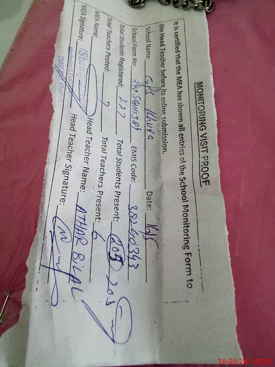 | Attendance Register | Head Teacher | MEA with School | Visit Proof |