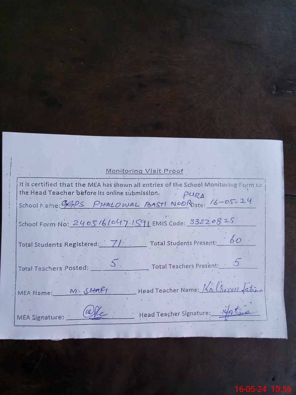 | Attendance Register | Head Teacher | MEA with School | Visit Proof |