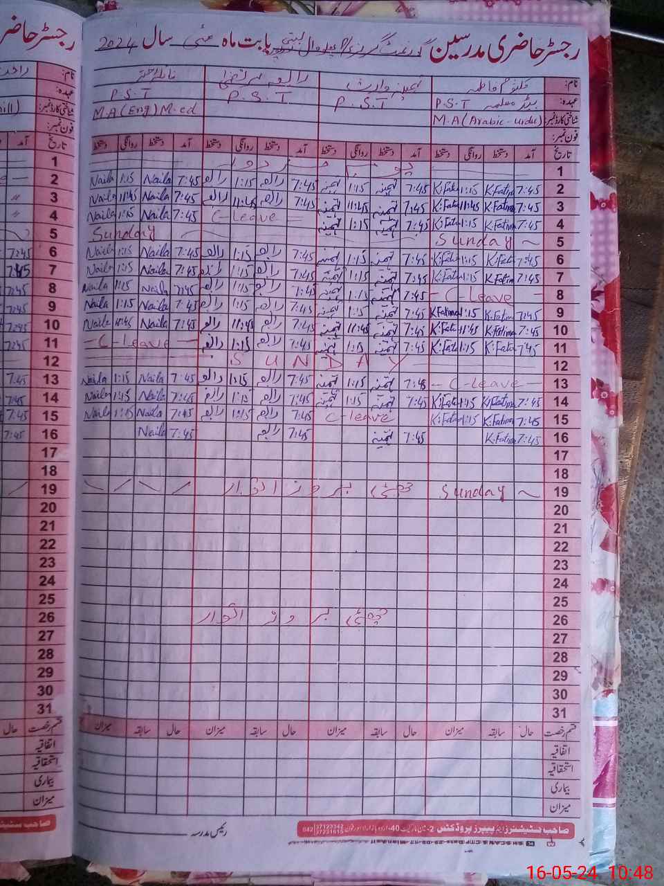 | CNIC | Full Name | Designation | R/C | Absence During Last Calender Month |