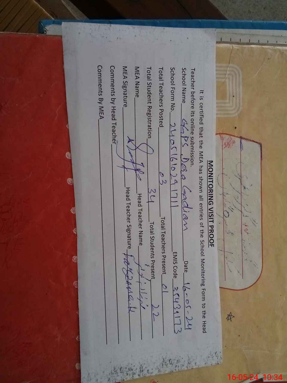 | Attendance Register | Head Teacher | MEA with School | Visit Proof |