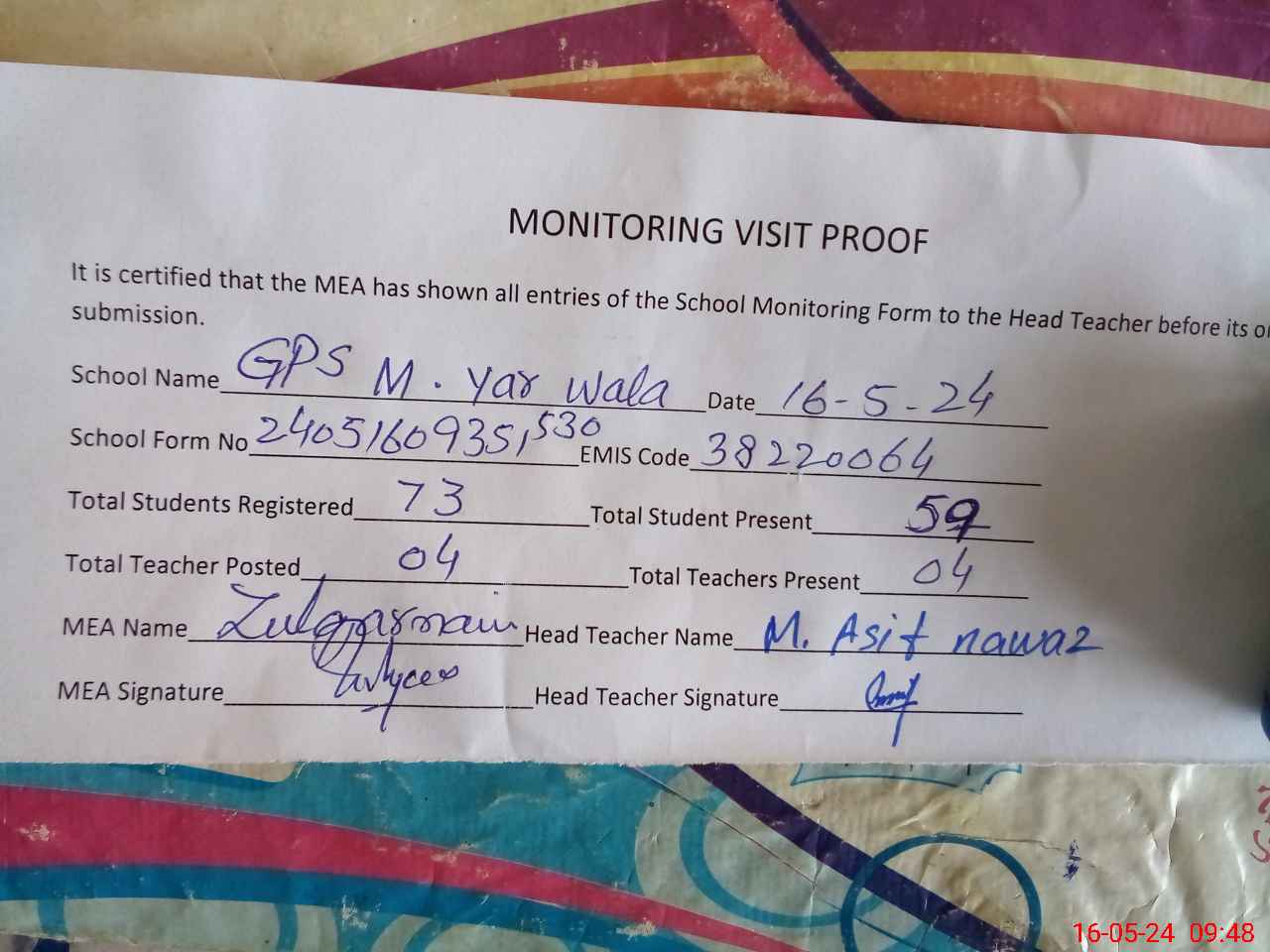 | EMIS Code: 38220064 | Name of School: GPS MUHAMMAD YAR WALA | |||