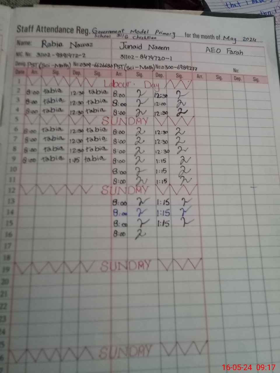 | CNIC | Full Name | Designation | R/C | Absence during last cal. month |