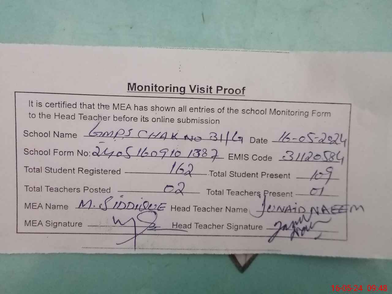 | Attendance Register | Head Teacher | MEA with School | Visit Proof |