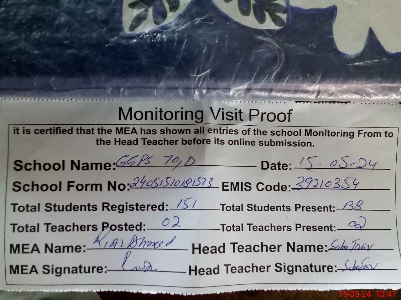 | Attendance Register | Head Teacher | MEA with School | Visit Proof |