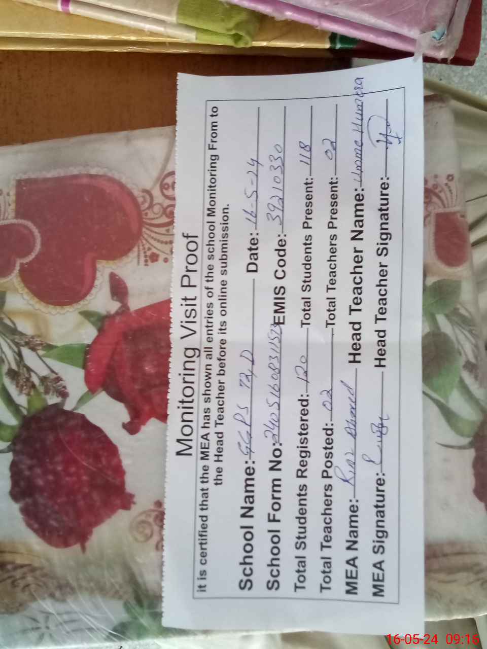 | Attendance Register | Head Teacher | MEA with School | Visit Proof |