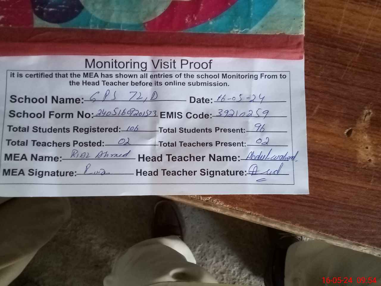 | EMIS Code: 39210259 | Name of School: GPS CHAK NO. 72 D | |||