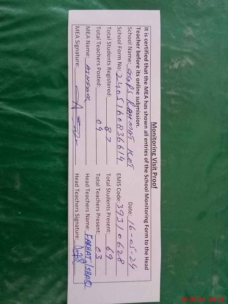 | Attendance Register | Head Teacher | MEA with School | Visit Proof |