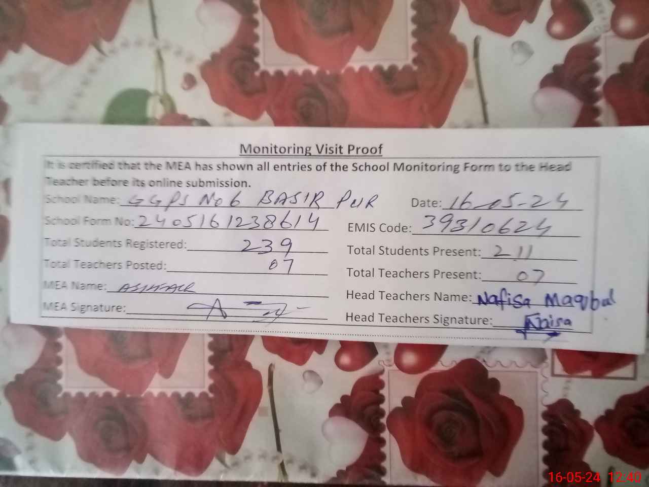 | Certified that this School was Inspected by the Undersigned MEA/DMO Today and the Information Stated Above is as Per Record. | |||||