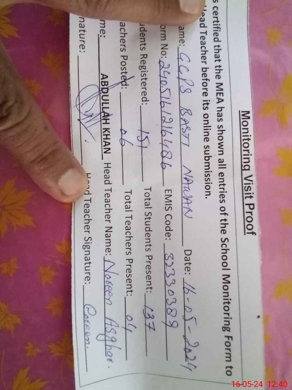 | Name: NO**** AS**** Designation: (School Headmaster's/Headmistress's) PST Phone/Cell Number: 03**** |