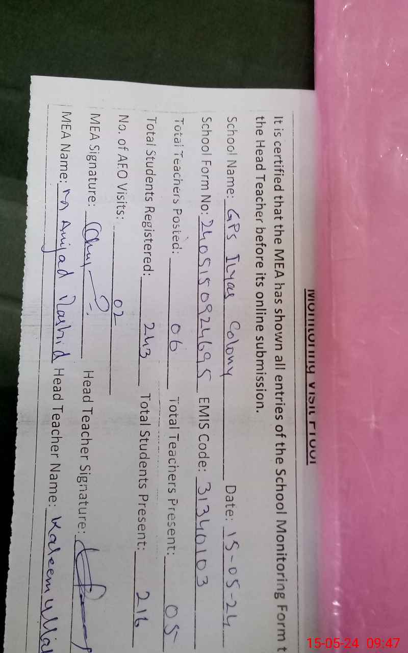 | EMIS Code: 31340103 | Name of School: GPS ALYAS COLONY | |||