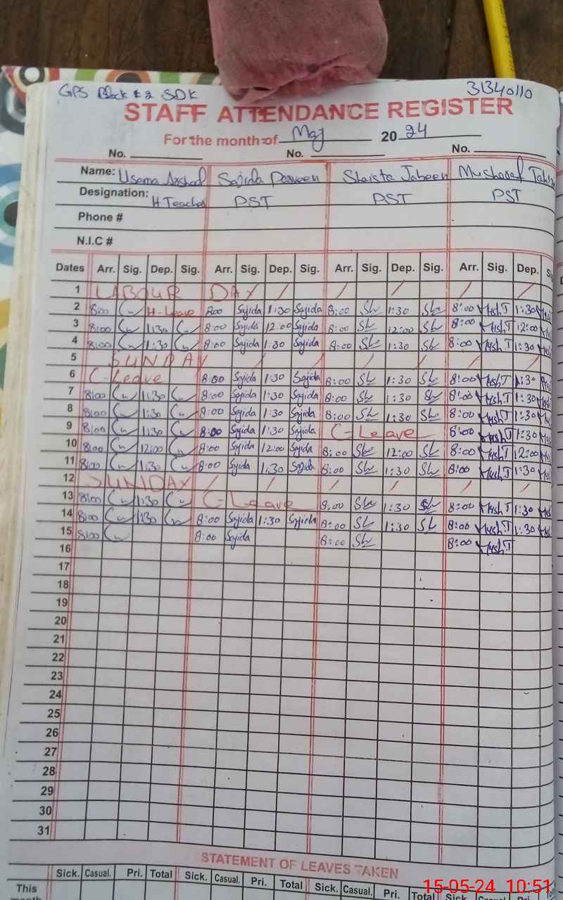 | CNIC | Full Name | Designation | R/C | Absence During Last Calender Month |